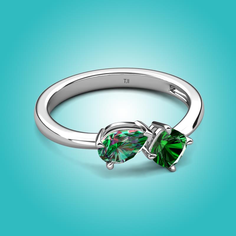 The Lab Created Alexandrite Pear Shape and Lab Created Emerald Cushion Shape Two Stone Engagement Ring of 1.41 ctw set in a Prong setting, is a stunning piece of jewelry that features a unique "Toi et Moi" design, which means "You and Me" in French, symbolizing the union of two souls in love and giving a comfort fit to the wearer.