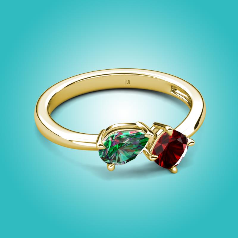 1.61 ctw Lab Created Alexandrite Pear Shape 7x5 mm & Red Garnet Cushion Shape 5.00 mm with Prong setting Two Stone Duo Women Engagement Ring in 14K Yellow Gold More Details ...