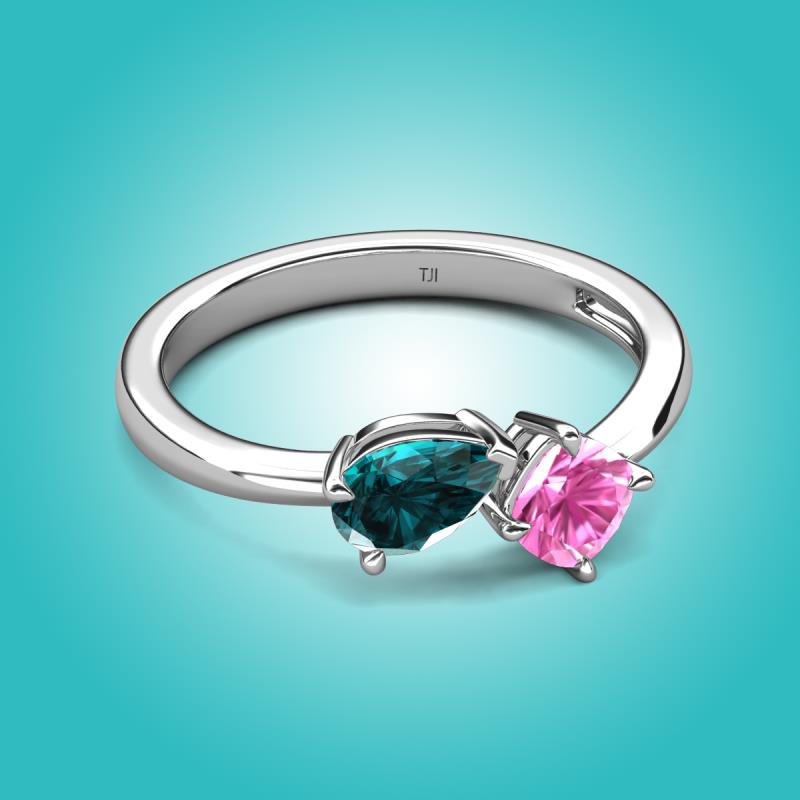 The London Blue Topaz Pear Shape and Lab Created Pink Sapphire Cushion Shape Two Stone Engagement Ring of 1.66 ctw set in a Prong setting, is a stunning piece of jewelry that features a unique "Toi et Moi" design, which means "You and Me" in French, symbolizing the union of two souls in love and giving a comfort fit to the wearer.