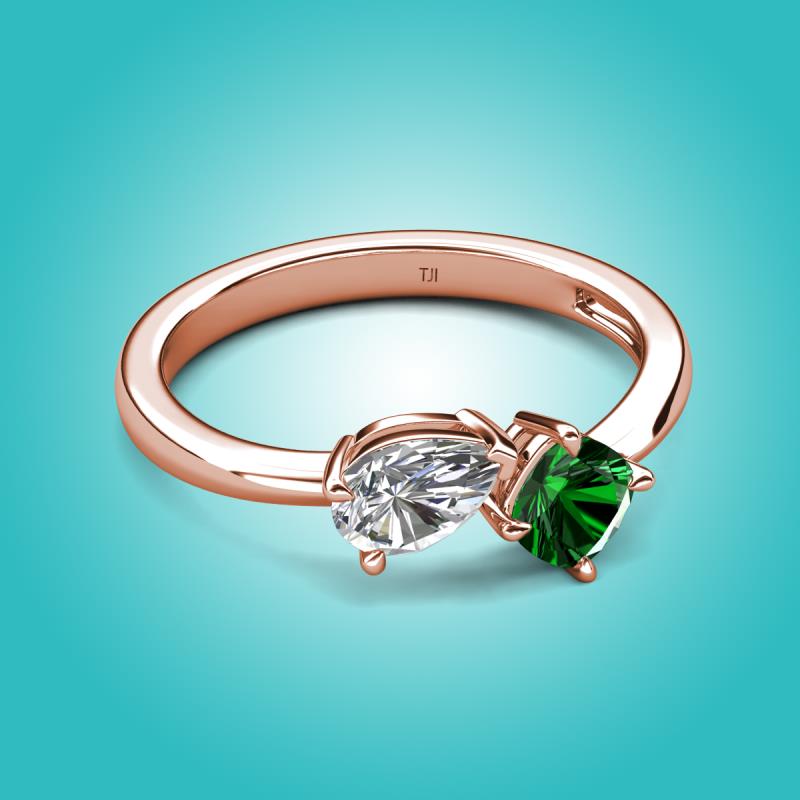 1.40 ctw Moissanite Pear Shape 7x5 mm & Lab Created Emerald Cushion Shape 5.00 mm with Prong setting Two Stone Duo Women Engagement Ring in 18K Rose Gold More Details ...
