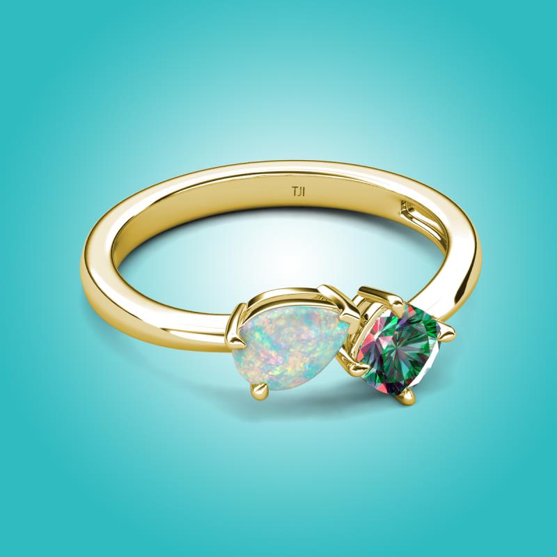 1.16 ctw Opal Pear Shape 7x5 mm & Lab Created Alexandrite Cushion Shape 5.00 mm with Prong setting Two Stone Duo Women Engagement Ring in 14K Yellow Gold More Details ...