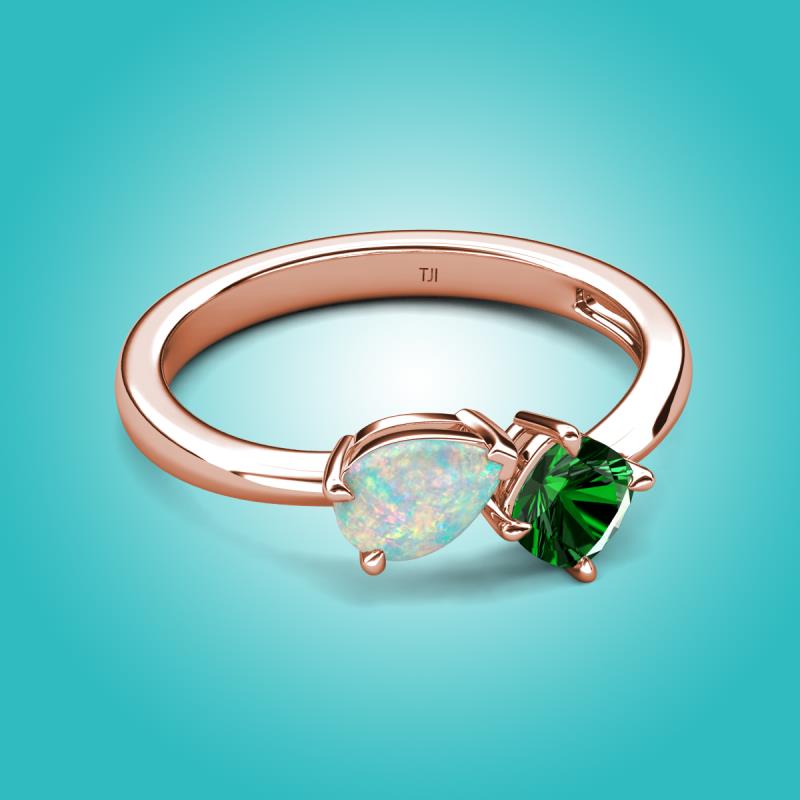 The Opal Pear Shape and Lab Created Emerald Cushion Shape Two Stone Engagement Ring of 0.90 ctw set in a Prong setting, is a stunning piece of jewelry that features a unique "Toi et Moi" design, which means "You and Me" in French, symbolizing the union of two souls in love and giving a comfort fit to the wearer.