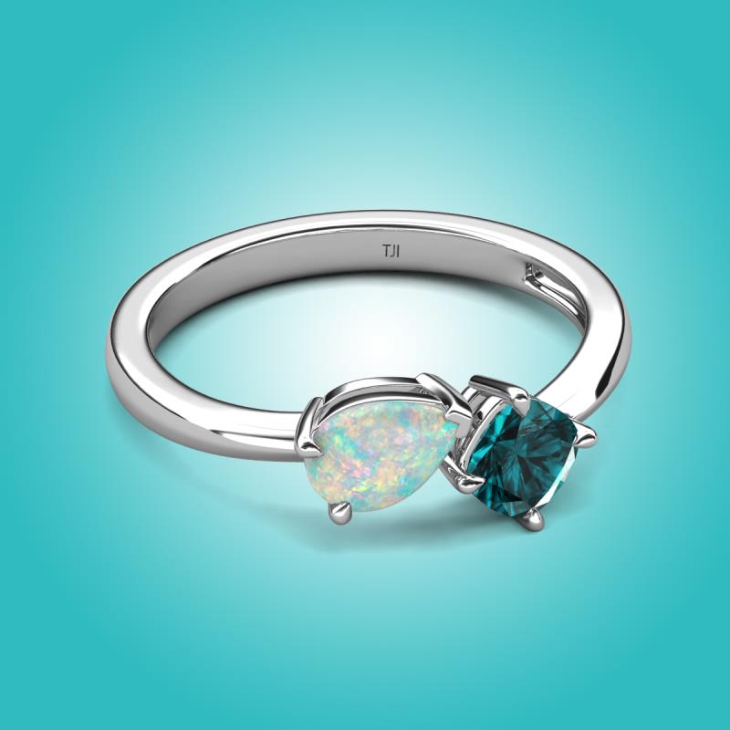 The Opal Pear Shape and London Blue Topaz Cushion Shape Two Stone Engagement Ring of 1.10 ctw set in a Prong setting, is a stunning piece of jewelry that features a unique "Toi et Moi" design, which means "You and Me" in French, symbolizing the union of two souls in love and giving a comfort fit to the wearer.