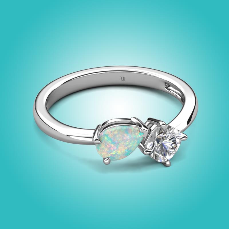 The Opal Pear Shape and Natural Diamond Cushion Shape Two Stone Engagement Ring of 0.85 ctw set in a Prong setting, is a stunning piece of jewelry that features a unique "Toi et Moi" design, which means "You and Me" in French, symbolizing the union of two souls in love and giving a comfort fit to the wearer.