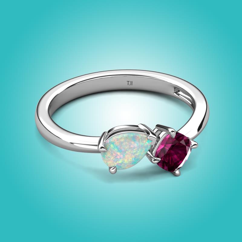 The Opal Pear Shape and Rhodolite Garnet Cushion Shape Two Stone Engagement Ring of 0.97 ctw set in a Prong setting, is a stunning piece of jewelry that features a unique "Toi et Moi" design, which means "You and Me" in French, symbolizing the union of two souls in love and giving a comfort fit to the wearer.