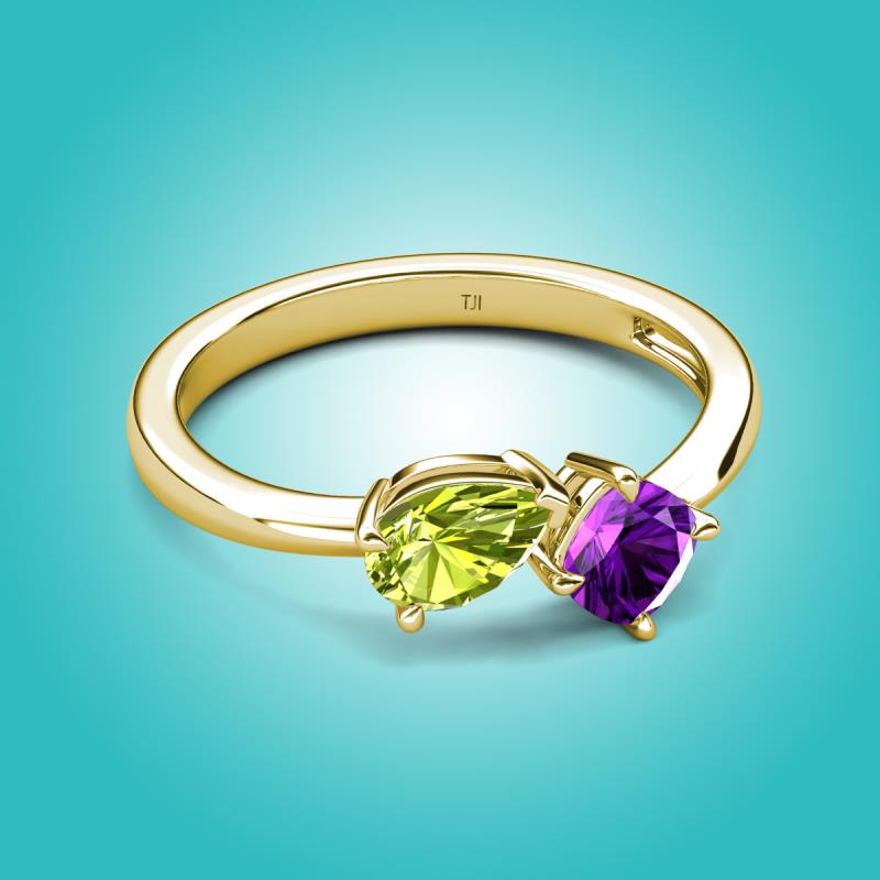 The Peridot Pear Shape and Amethyst Cushion Shape Two Stone Engagement Ring of 1.30 ctw set in a Prong setting, is a stunning piece of jewelry that features a unique "Toi et Moi" design, which means "You and Me" in French, symbolizing the union of two souls in love and giving a comfort fit to the wearer.