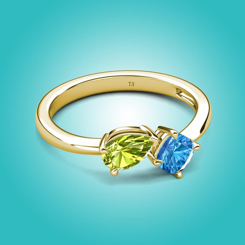 1.55 ctw Peridot Pear Shape 7x5 mm & Blue Topaz Cushion Shape 5.00 mm with Prong setting Two Stone Duo Women Engagement Ring in 14K Yellow Gold More Details ...
