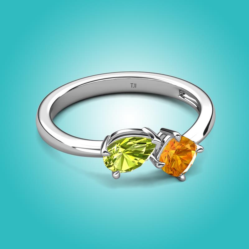 The Peridot Pear Shape and Citrine Cushion Shape Two Stone Engagement Ring of 1.30 ctw set in a Prong setting, is a stunning piece of jewelry that features a unique "Toi et Moi" design, which means "You and Me" in French, symbolizing the union of two souls in love and giving a comfort fit to the wearer.
