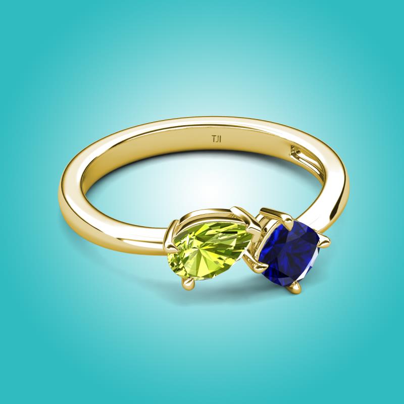 The Peridot Pear Shape and Lab Created Blue Sapphire Cushion Shape Two Stone Engagement Ring of 1.61 ctw set in a Prong setting, is a stunning piece of jewelry that features a unique "Toi et Moi" design, which means "You and Me" in French, symbolizing the union of two souls in love and giving a comfort fit to the wearer.