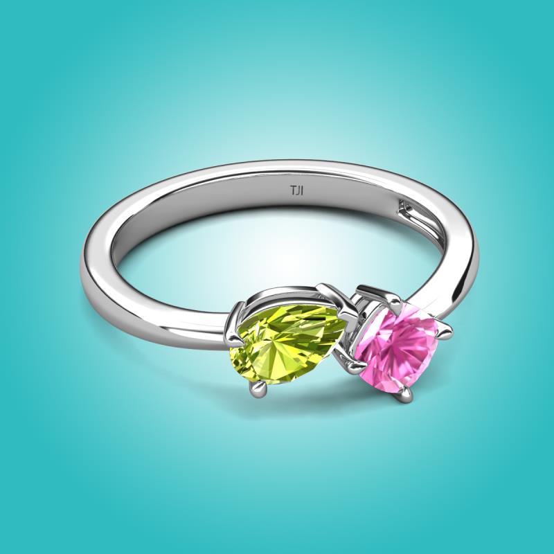 The Peridot Pear Shape and Lab Created Pink Sapphire Cushion Shape Two Stone Engagement Ring of 1.61 ctw set in a Prong setting, is a stunning piece of jewelry that features a unique "Toi et Moi" design, which means "You and Me" in French, symbolizing the union of two souls in love and giving a comfort fit to the wearer.