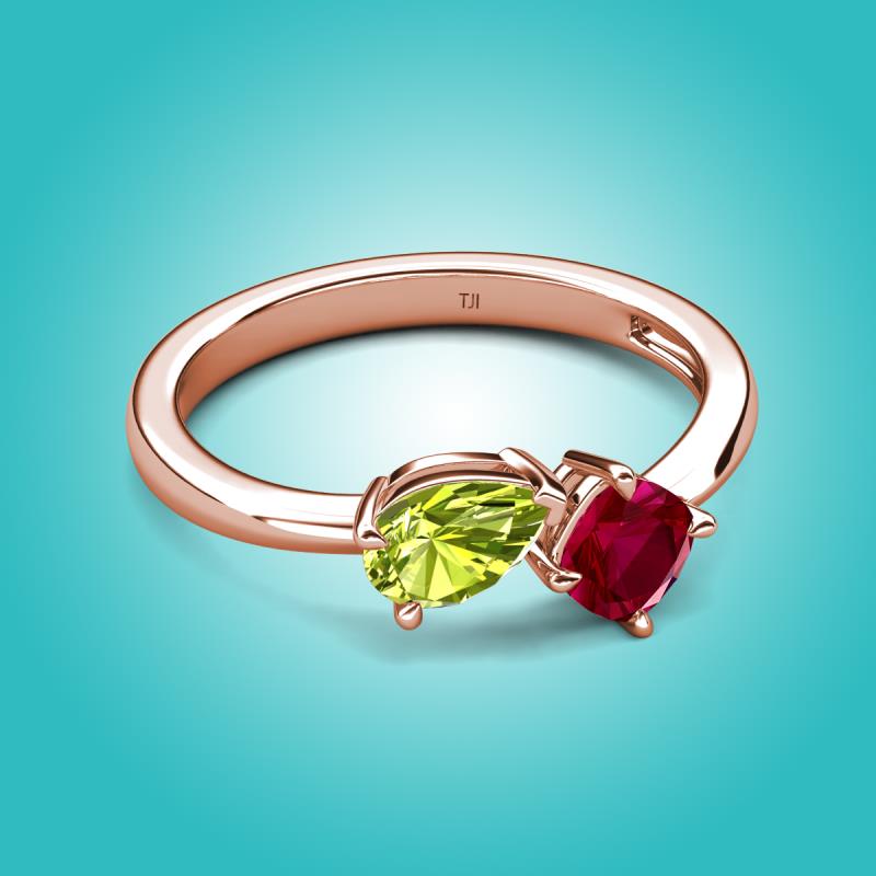 The Peridot Pear Shape and Lab Created Ruby Cushion Shape Two Stone Engagement Ring of 1.61 ctw set in a Prong setting, is a stunning piece of jewelry that features a unique "Toi et Moi" design, which means "You and Me" in French, symbolizing the union of two souls in love and giving a comfort fit to the wearer.