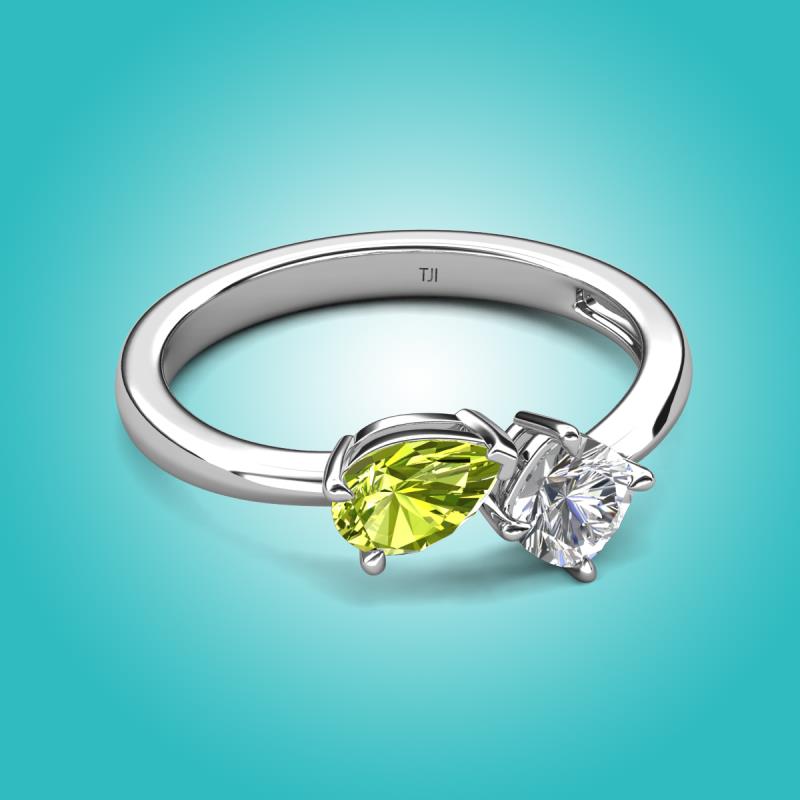 The Peridot Pear Shape and Moissanite Cushion Shape Two Stone Engagement Ring of 1.37 ctw set in a Prong setting, is a stunning piece of jewelry that features a unique "Toi et Moi" design, which means "You and Me" in French, symbolizing the union of two souls in love and giving a comfort fit to the wearer.