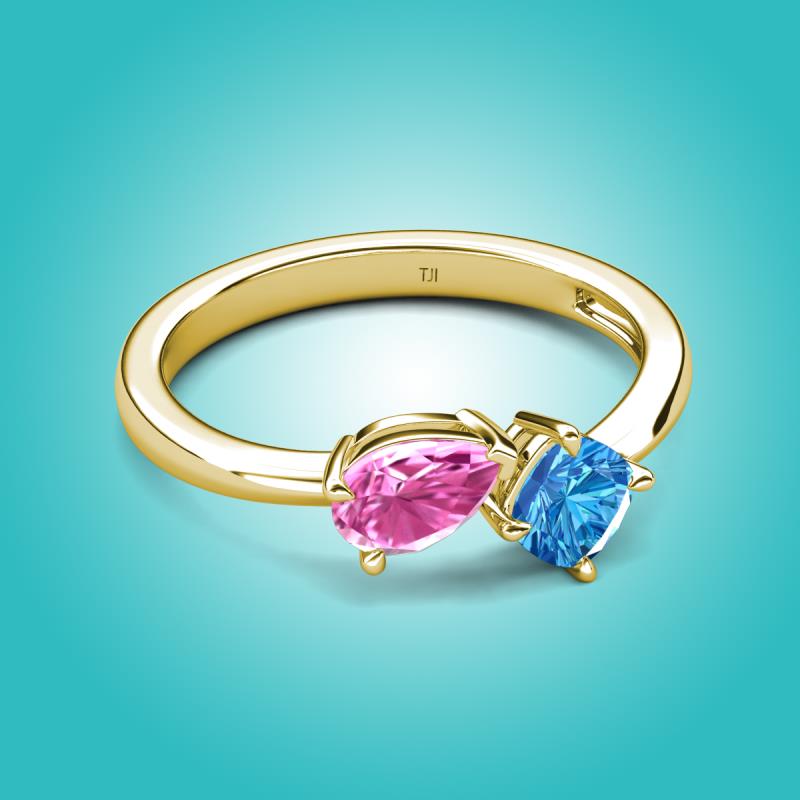 1.65 ctw Pink Sapphire Pear Shape 7x5 mm & Blue Topaz Cushion Shape 5.00 mm with Prong setting Two Stone Duo Women Engagement Ring in 14K Yellow Gold More Details ...