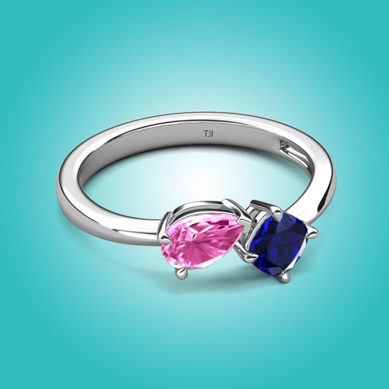 The Pink Sapphire Pear Shape and Lab Created Blue Sapphire Cushion Shape Two Stone Engagement Ring of 1.71 ctw set in a Prong setting, is a stunning piece of jewelry that features a unique "Toi et Moi" design, which means "You and Me" in French, symbolizing the union of two souls in love and giving a comfort fit to the wearer.