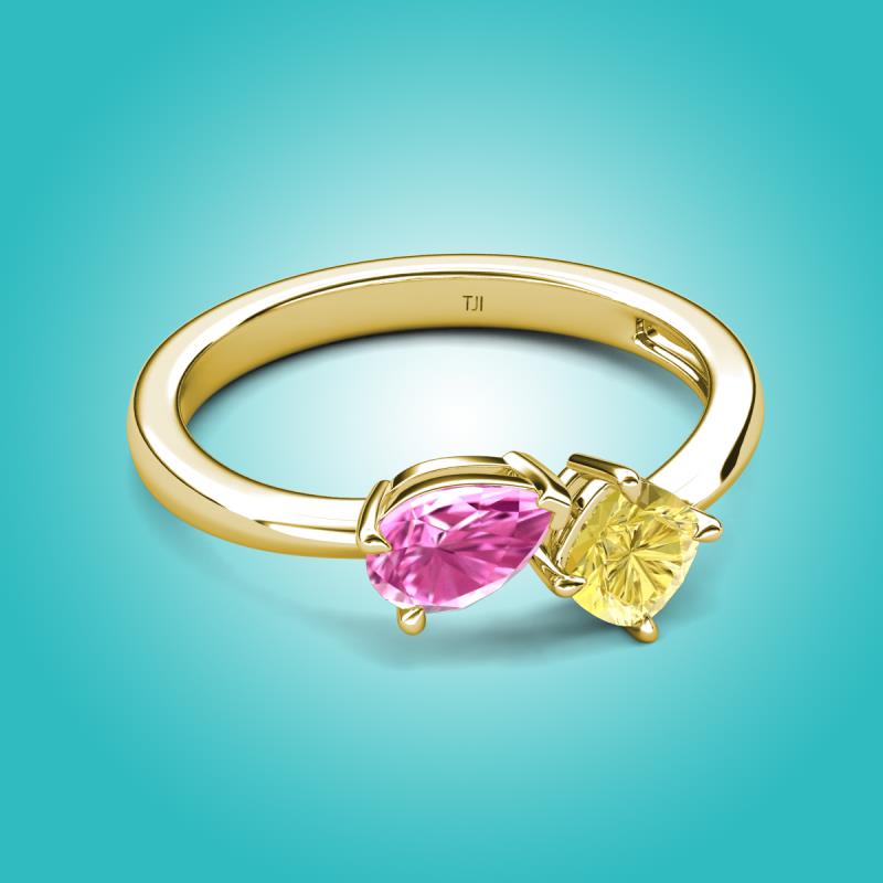 The Pink Sapphire Pear Shape and Lab Created Yellow Sapphire Cushion Shape Two Stone Engagement Ring of 1.71 ctw set in a Prong setting, is a stunning piece of jewelry that features a unique "Toi et Moi" design, which means "You and Me" in French, symbolizing the union of two souls in love and giving a comfort fit to the wearer.