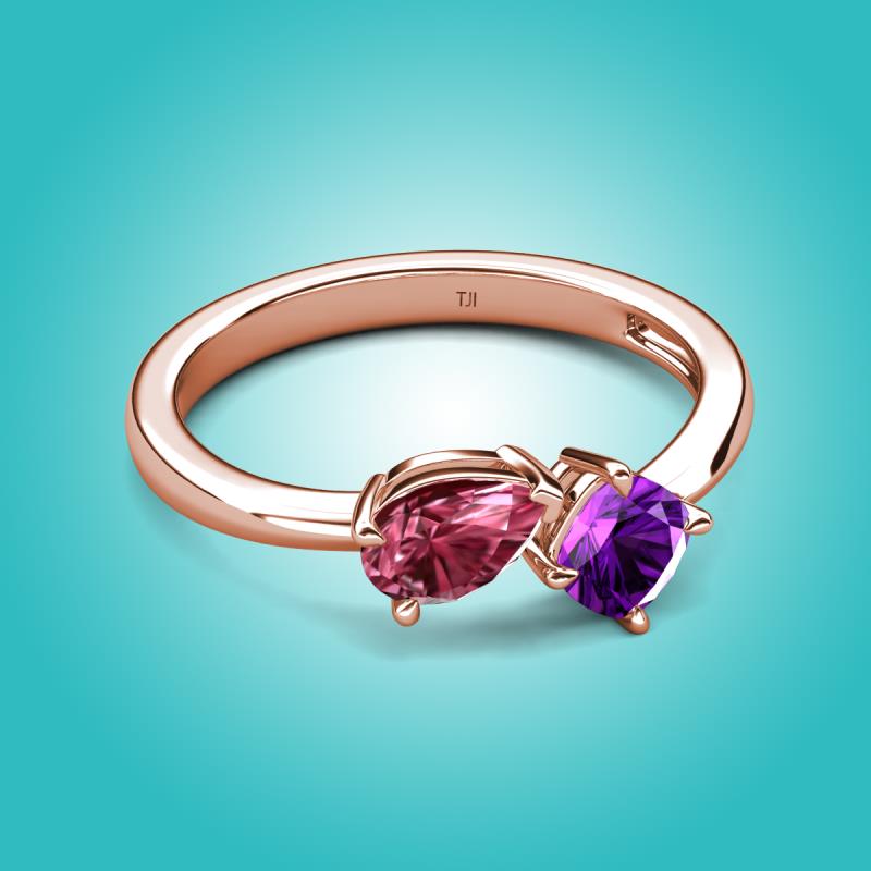 The Pink Tourmaline Pear Shape and Amethyst Cushion Shape Two Stone Engagement Ring of 1.20 ctw set in a Prong setting, is a stunning piece of jewelry that features a unique "Toi et Moi" design, which means "You and Me" in French, symbolizing the union of two souls in love and giving a comfort fit to the wearer.
