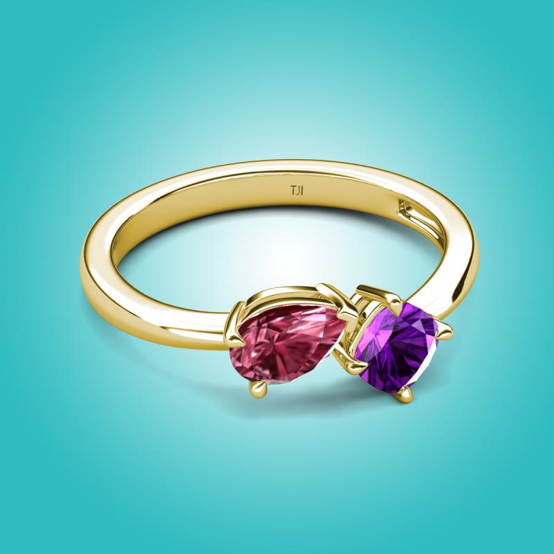 1.20 ctw Pink Tourmaline Pear Shape 7x5 mm & Amethyst Cushion Shape 5.00 mm with Prong setting Two Stone Duo Women Engagement Ring in 14K Yellow Gold More Details ...