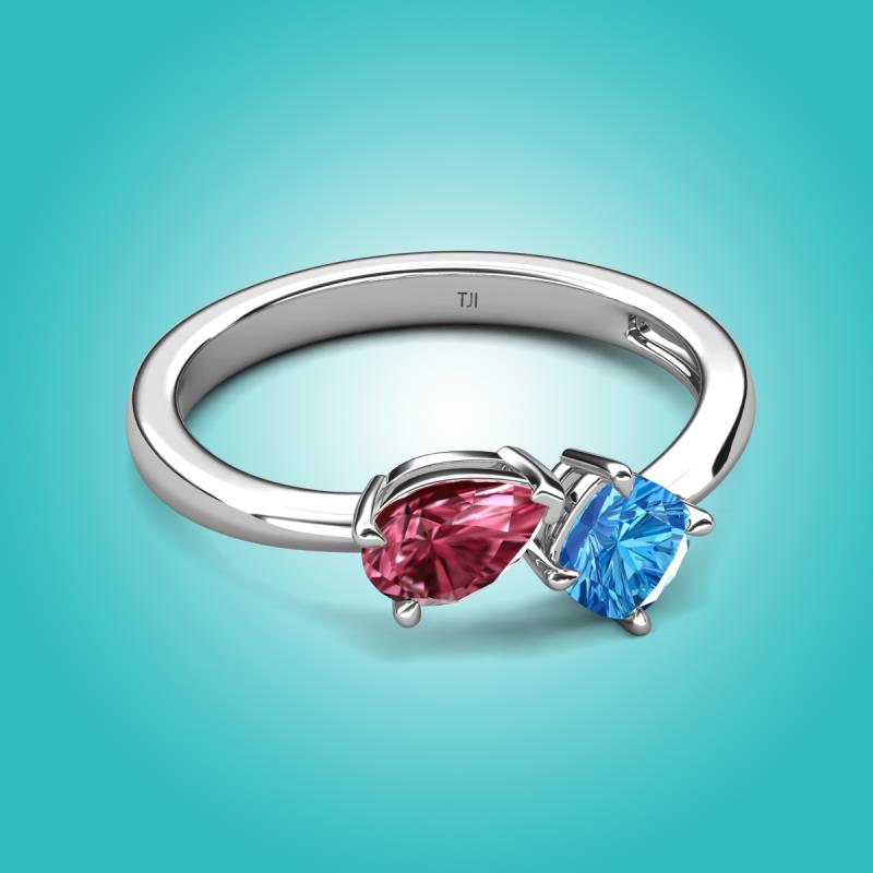 The Pink Tourmaline Pear Shape and Blue Topaz Cushion Shape Two Stone Engagement Ring of 1.45 ctw set in a Prong setting, is a stunning piece of jewelry that features a unique "Toi et Moi" design, which means "You and Me" in French, symbolizing the union of two souls in love and giving a comfort fit to the wearer.