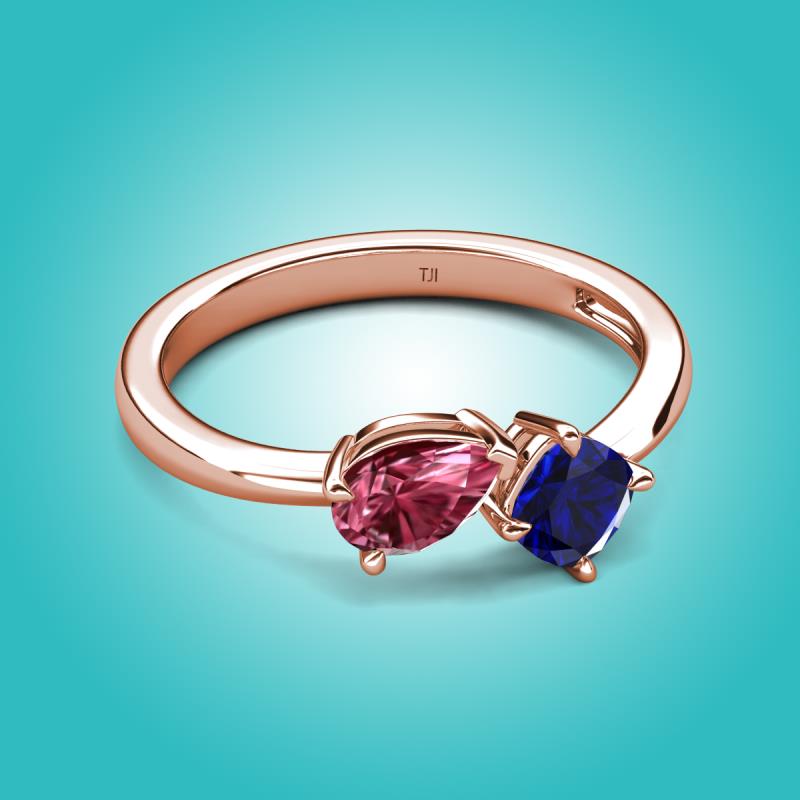 The Pink Tourmaline Pear Shape and Lab Created Blue Sapphire Cushion Shape Two Stone Engagement Ring of 1.51 ctw set in a Prong setting, is a stunning piece of jewelry that features a unique "Toi et Moi" design, which means "You and Me" in French, symbolizing the union of two souls in love and giving a comfort fit to the wearer.