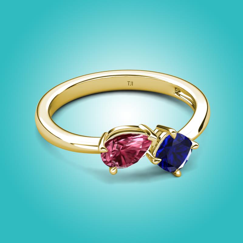 1.51 ctw Pink Tourmaline Pear Shape 7x5 mm & Lab Created Blue Sapphire Cushion Shape 5.00 mm with Prong setting Two Stone Duo Women Engagement Ring in 14K Yellow Gold More Details ...