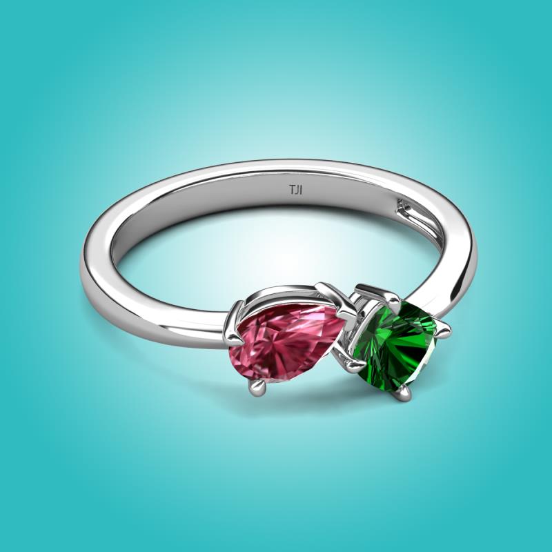 The Pink Tourmaline Pear Shape and Lab Created Emerald Cushion Shape Two Stone Engagement Ring of 1.25 ctw set in a Prong setting, is a stunning piece of jewelry that features a unique "Toi et Moi" design, which means "You and Me" in French, symbolizing the union of two souls in love and giving a comfort fit to the wearer.