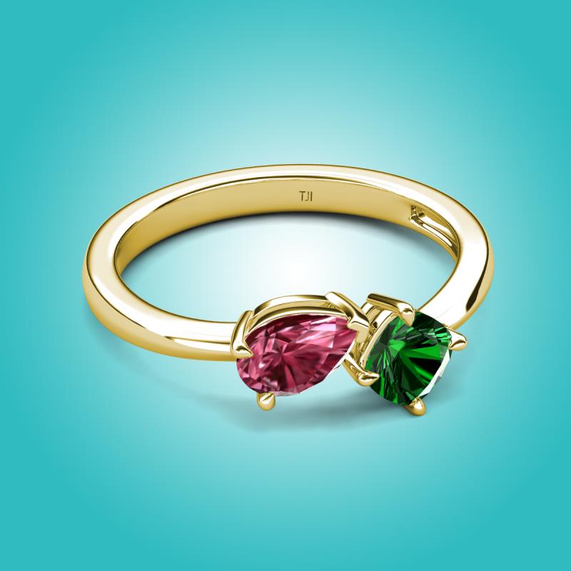 1.25 ctw Pink Tourmaline Pear Shape 7x5 mm & Lab Created Emerald Cushion Shape 5.00 mm with Prong setting Two Stone Duo Women Engagement Ring in 14K Yellow Gold More Details ...