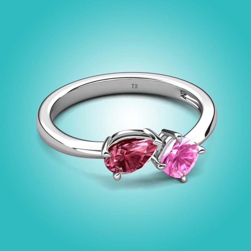 The Pink Tourmaline Pear Shape and Lab Created Pink Sapphire Cushion Shape Two Stone Engagement Ring of 1.51 ctw set in a Prong setting, is a stunning piece of jewelry that features a unique "Toi et Moi" design, which means "You and Me" in French, symbolizing the union of two souls in love and giving a comfort fit to the wearer.