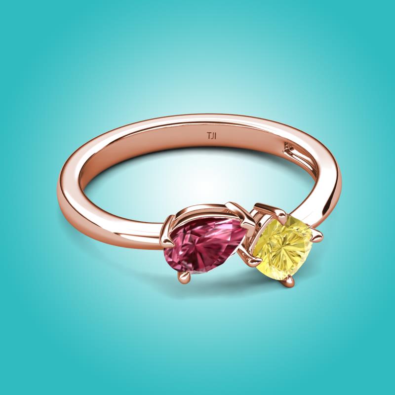 The Pink Tourmaline Pear Shape and Lab Created Yellow Sapphire Cushion Shape Two Stone Engagement Ring of 1.51 ctw set in a Prong setting, is a stunning piece of jewelry that features a unique "Toi et Moi" design, which means "You and Me" in French, symbolizing the union of two souls in love and giving a comfort fit to the wearer.