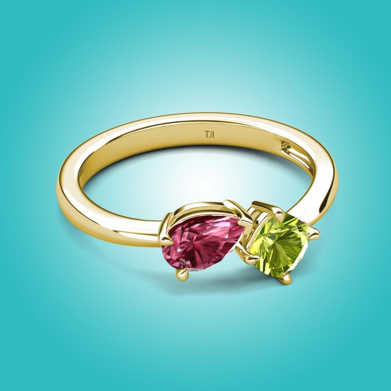 1.35 ctw Pink Tourmaline Pear Shape 7x5 mm & Peridot Cushion Shape 5.00 mm with Prong setting Two Stone Duo Women Engagement Ring in 14K Yellow Gold More Details ...