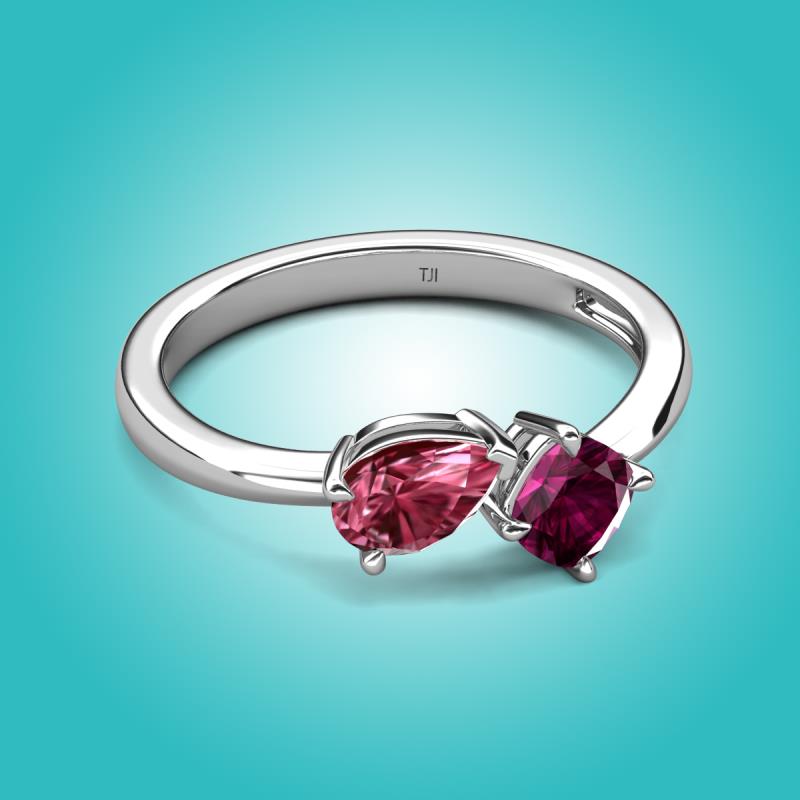 The Pink Tourmaline Pear Shape and Rhodolite Garnet Cushion Shape Two Stone Engagement Ring of 1.32 ctw set in a Prong setting, is a stunning piece of jewelry that features a unique "Toi et Moi" design, which means "You and Me" in French, symbolizing the union of two souls in love and giving a comfort fit to the wearer.