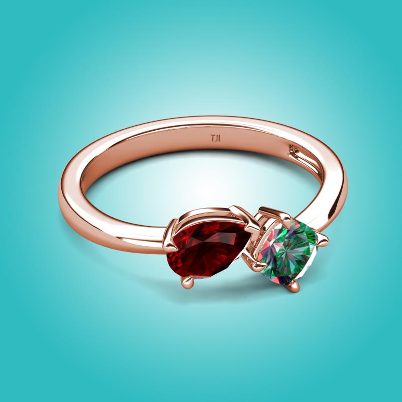 The Red Garnet Pear Shape and Lab Created Alexandrite Cushion Shape Two Stone Engagement Ring of 1.71 ctw set in a Prong setting, is a stunning piece of jewelry that features a unique "Toi et Moi" design, which means "You and Me" in French, symbolizing the union of two souls in love and giving a comfort fit to the wearer.