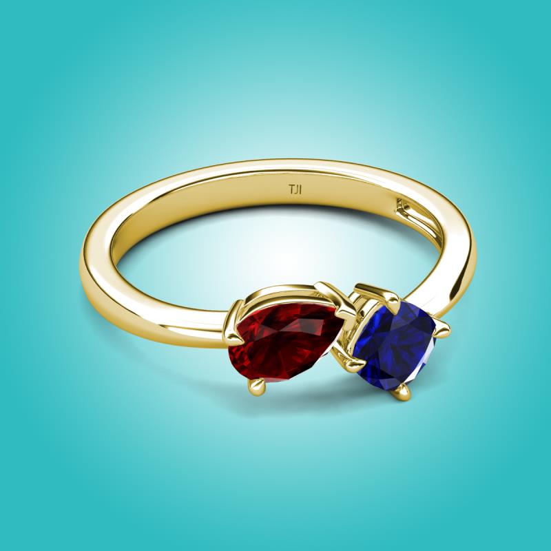 1.71 ctw Red Garnet Pear Shape 7x5 mm & Lab Created Blue Sapphire Cushion Shape 5.00 mm with Prong setting Two Stone Duo Women Engagement Ring in 14K Yellow Gold More Details ...