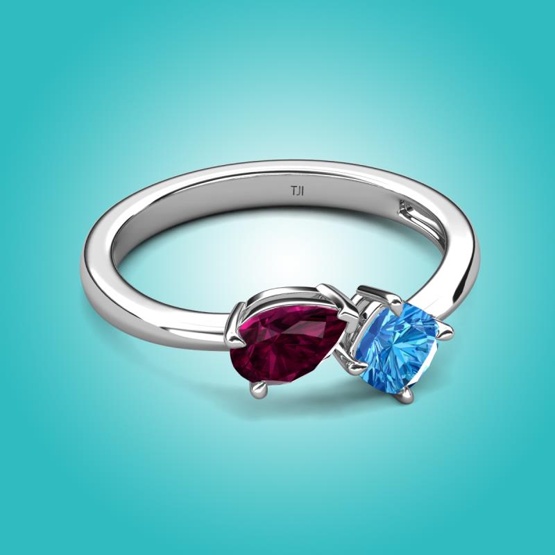 The Rhodolite Garnet Pear Shape and Blue Topaz Cushion Shape Two Stone Engagement Ring of 1.65 ctw set in a Prong setting, is a stunning piece of jewelry that features a unique "Toi et Moi" design, which means "You and Me" in French, symbolizing the union of two souls in love and giving a comfort fit to the wearer.