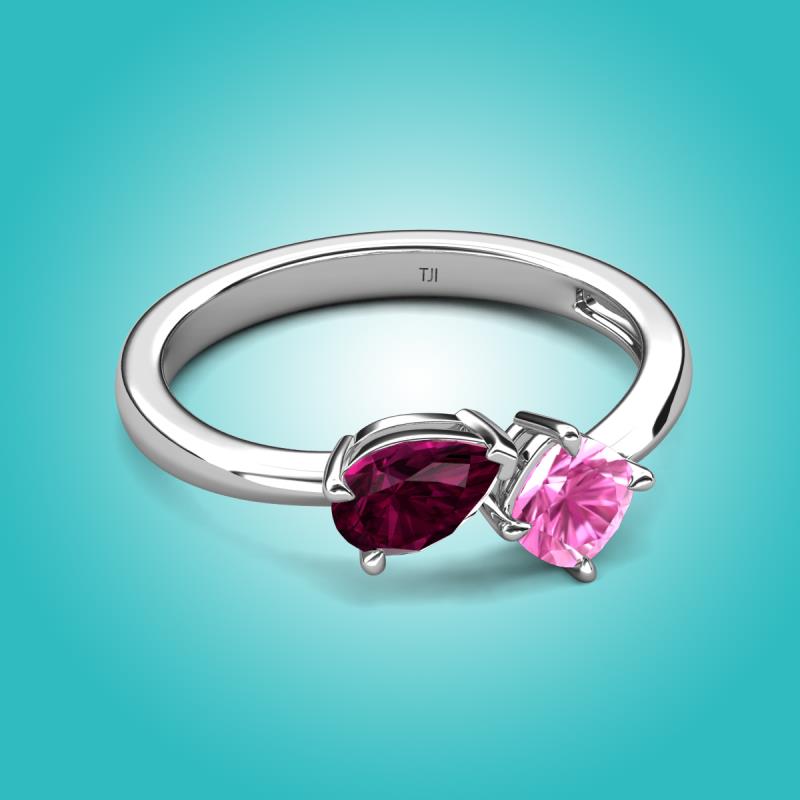 The Rhodolite Garnet Pear Shape and Lab Created Pink Sapphire Cushion Shape Two Stone Engagement Ring of 1.71 ctw set in a Prong setting, is a stunning piece of jewelry that features a unique "Toi et Moi" design, which means "You and Me" in French, symbolizing the union of two souls in love and giving a comfort fit to the wearer.