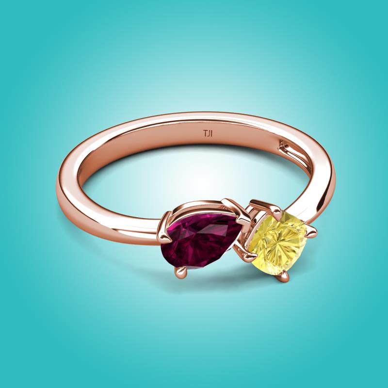 The Rhodolite Garnet Pear Shape and Lab Created Yellow Sapphire Cushion Shape Two Stone Engagement Ring of 1.71 ctw set in a Prong setting, is a stunning piece of jewelry that features a unique "Toi et Moi" design, which means "You and Me" in French, symbolizing the union of two souls in love and giving a comfort fit to the wearer.