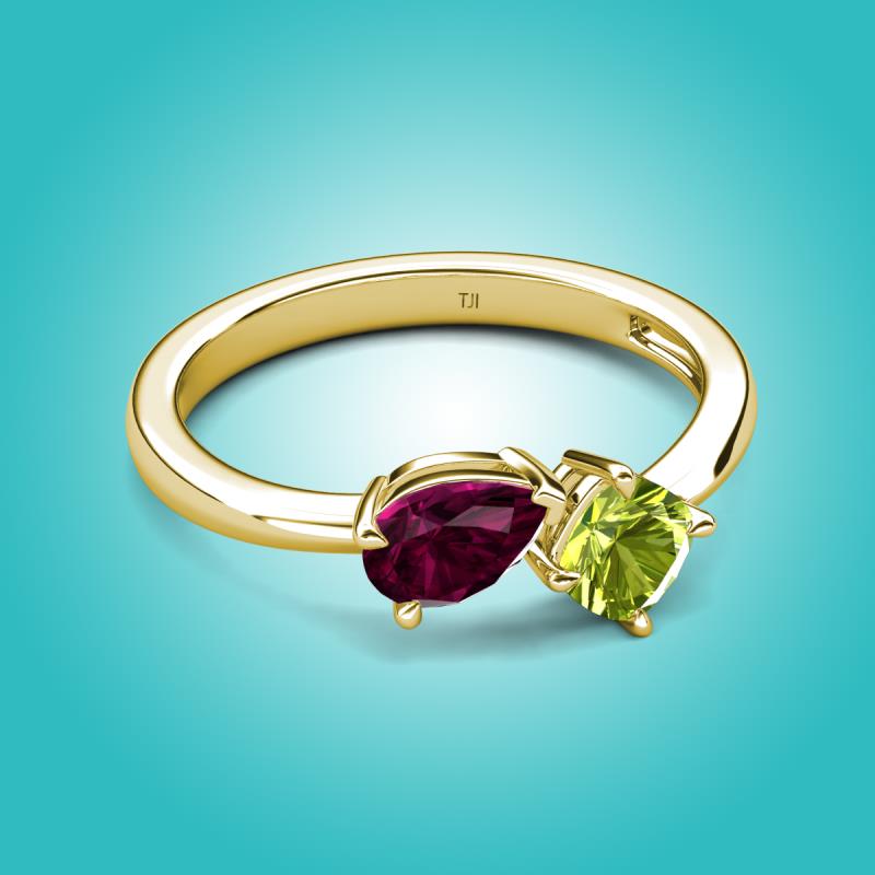1.55 ctw Rhodolite Garnet Pear Shape 7x5 mm & Peridot Cushion Shape 5.00 mm with Prong setting Two Stone Duo Women Engagement Ring in 14K Yellow Gold More Details ...