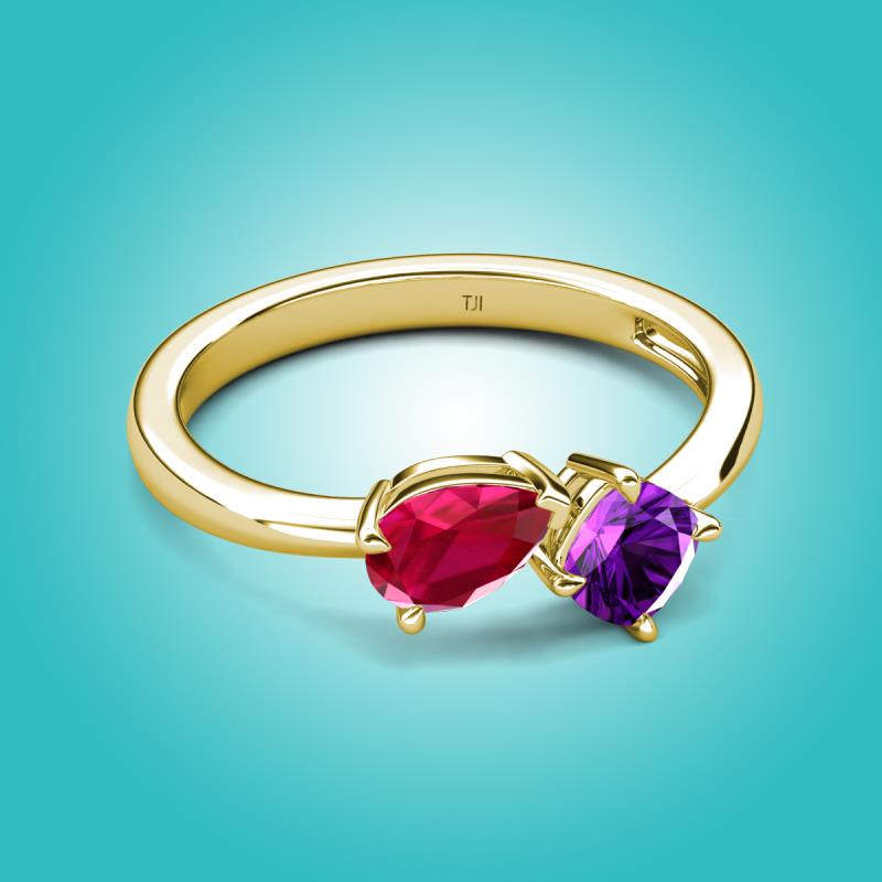 1.45 ctw Ruby Pear Shape 7x5 mm & Amethyst Cushion Shape 5.00 mm with Prong setting Two Stone Duo Women Engagement Ring in 14K Yellow Gold More Details ...