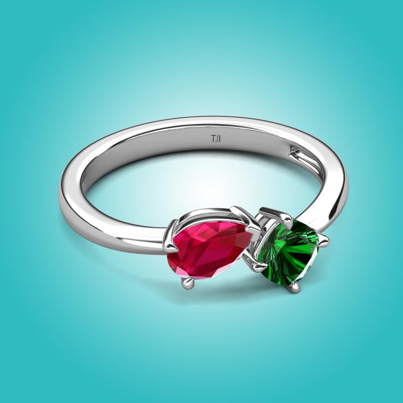 1.50 ctw Ruby Pear Shape 7x5 mm & Lab Created Emerald Cushion Shape 5.00 mm with Prong setting Two Stone Duo Women Engagement Ring in 18K White Gold More Details ...