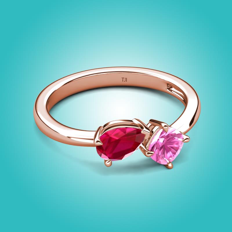 The Ruby Pear Shape and Lab Created Pink Sapphire Cushion Shape Two Stone Engagement Ring of 1.76 ctw set in a Prong setting, is a stunning piece of jewelry that features a unique "Toi et Moi" design, which means "You and Me" in French, symbolizing the union of two souls in love and giving a comfort fit to the wearer.