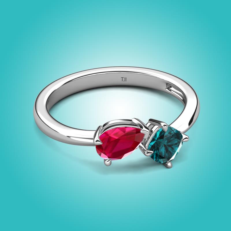 The Ruby Pear Shape and London Blue Topaz Cushion Shape Two Stone Engagement Ring of 1.70 ctw set in a Prong setting, is a stunning piece of jewelry that features a unique "Toi et Moi" design, which means "You and Me" in French, symbolizing the union of two souls in love and giving a comfort fit to the wearer.