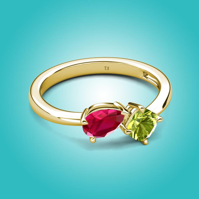 1.60 ctw Ruby Pear Shape 7x5 mm & Peridot Cushion Shape 5.00 mm with Prong setting Two Stone Duo Women Engagement Ring in 18K Yellow Gold More Details ...