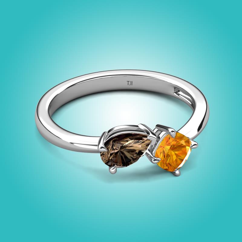 The Smoky Quartz Pear Shape and Citrine Cushion Shape Two Stone Engagement Ring of 1.15 ctw set in a Prong setting, is a stunning piece of jewelry that features a unique "Toi et Moi" design, which means "You and Me" in French, symbolizing the union of two souls in love and giving a comfort fit to the wearer.