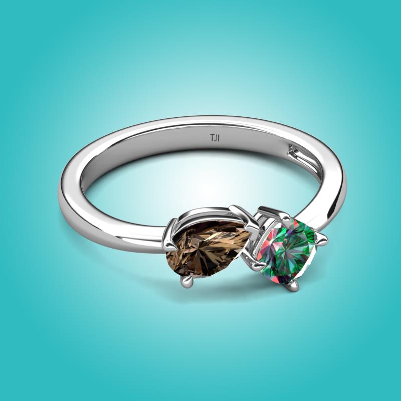 The Smoky Quartz Pear Shape and Lab Created Alexandrite Cushion Shape Two Stone Engagement Ring of 1.46 ctw set in a Prong setting, is a stunning piece of jewelry that features a unique "Toi et Moi" design, which means "You and Me" in French, symbolizing the union of two souls in love and giving a comfort fit to the wearer.