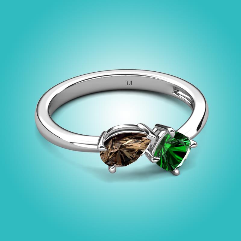 The Smoky Quartz Pear Shape and Lab Created Emerald Cushion Shape Two Stone Engagement Ring of 1.20 ctw set in a Prong setting, is a stunning piece of jewelry that features a unique "Toi et Moi" design, which means "You and Me" in French, symbolizing the union of two souls in love and giving a comfort fit to the wearer.