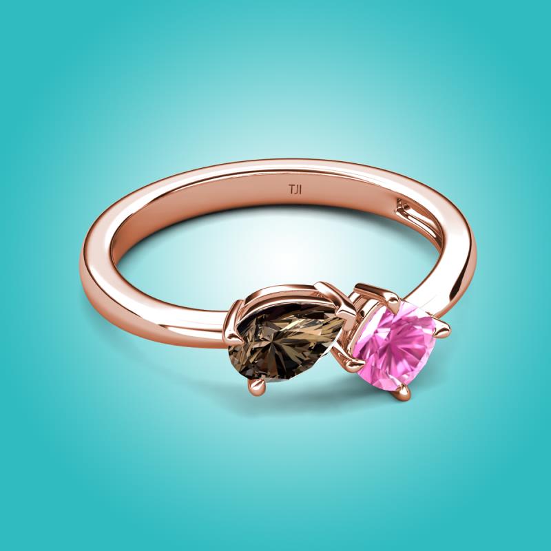The Smoky Quartz Pear Shape and Lab Created Pink Sapphire Cushion Shape Two Stone Engagement Ring of 1.46 ctw set in a Prong setting, is a stunning piece of jewelry that features a unique "Toi et Moi" design, which means "You and Me" in French, symbolizing the union of two souls in love and giving a comfort fit to the wearer.
