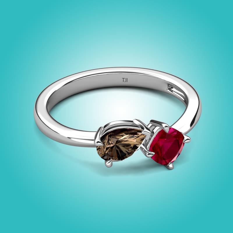 The Smoky Quartz Pear Shape and Lab Created Ruby Cushion Shape Two Stone Engagement Ring of 1.46 ctw set in a Prong setting, is a stunning piece of jewelry that features a unique "Toi et Moi" design, which means "You and Me" in French, symbolizing the union of two souls in love and giving a comfort fit to the wearer.