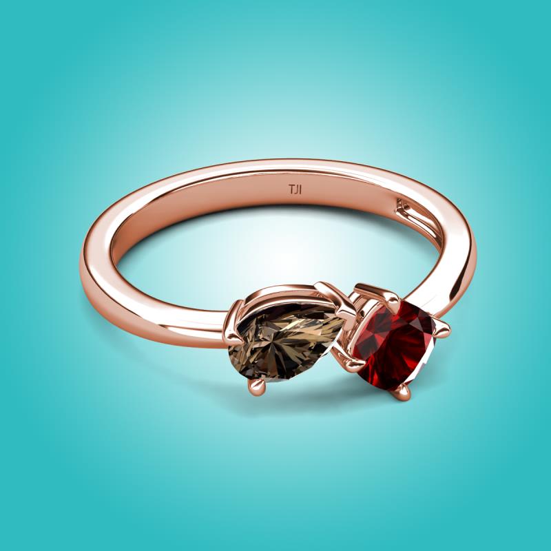 The Smoky Quartz Pear Shape and Red Garnet Cushion Shape Two Stone Engagement Ring of 1.40 ctw set in a Prong setting, is a stunning piece of jewelry that features a unique "Toi et Moi" design, which means "You and Me" in French, symbolizing the union of two souls in love and giving a comfort fit to the wearer.