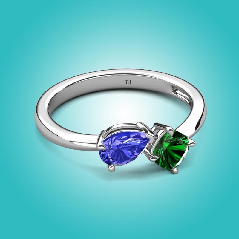 The Tanzanite Pear Shape and Lab Created Emerald Cushion Shape Two Stone Engagement Ring of 1.30 ctw set in a Prong setting, is a stunning piece of jewelry that features a unique "Toi et Moi" design, which means "You and Me" in French, symbolizing the union of two souls in love and giving a comfort fit to the wearer.