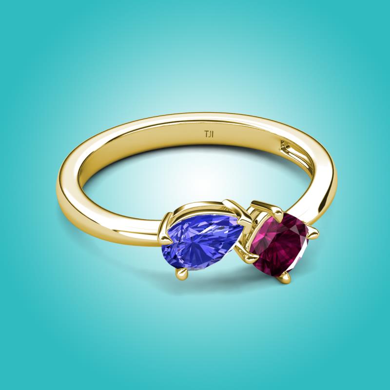 1.37 ctw Tanzanite Pear Shape 7x5 mm & Rhodolite Garnet Cushion Shape 5.00 mm with Prong setting Two Stone Duo Women Engagement Ring in 18K Yellow Gold More Details ...