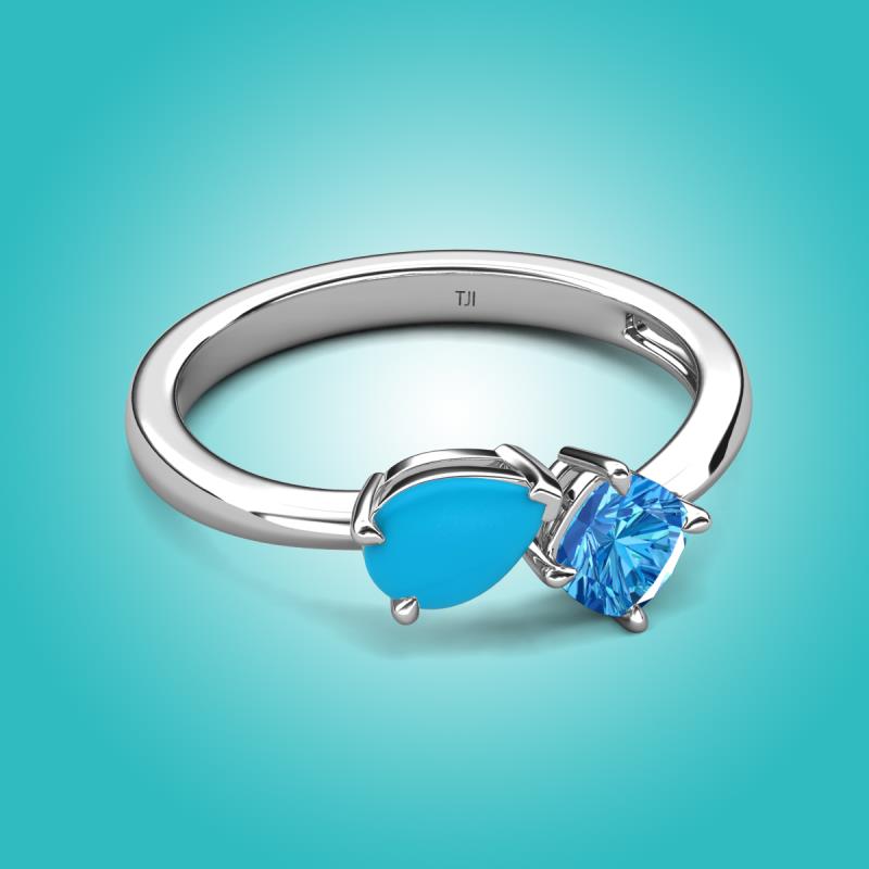 The Turquoise Pear Shape and Blue Topaz Cushion Shape Two Stone Engagement Ring of 1.10 ctw set in a Prong setting, is a stunning piece of jewelry that features a unique "Toi et Moi" design, which means "You and Me" in French, symbolizing the union of two souls in love and giving a comfort fit to the wearer.